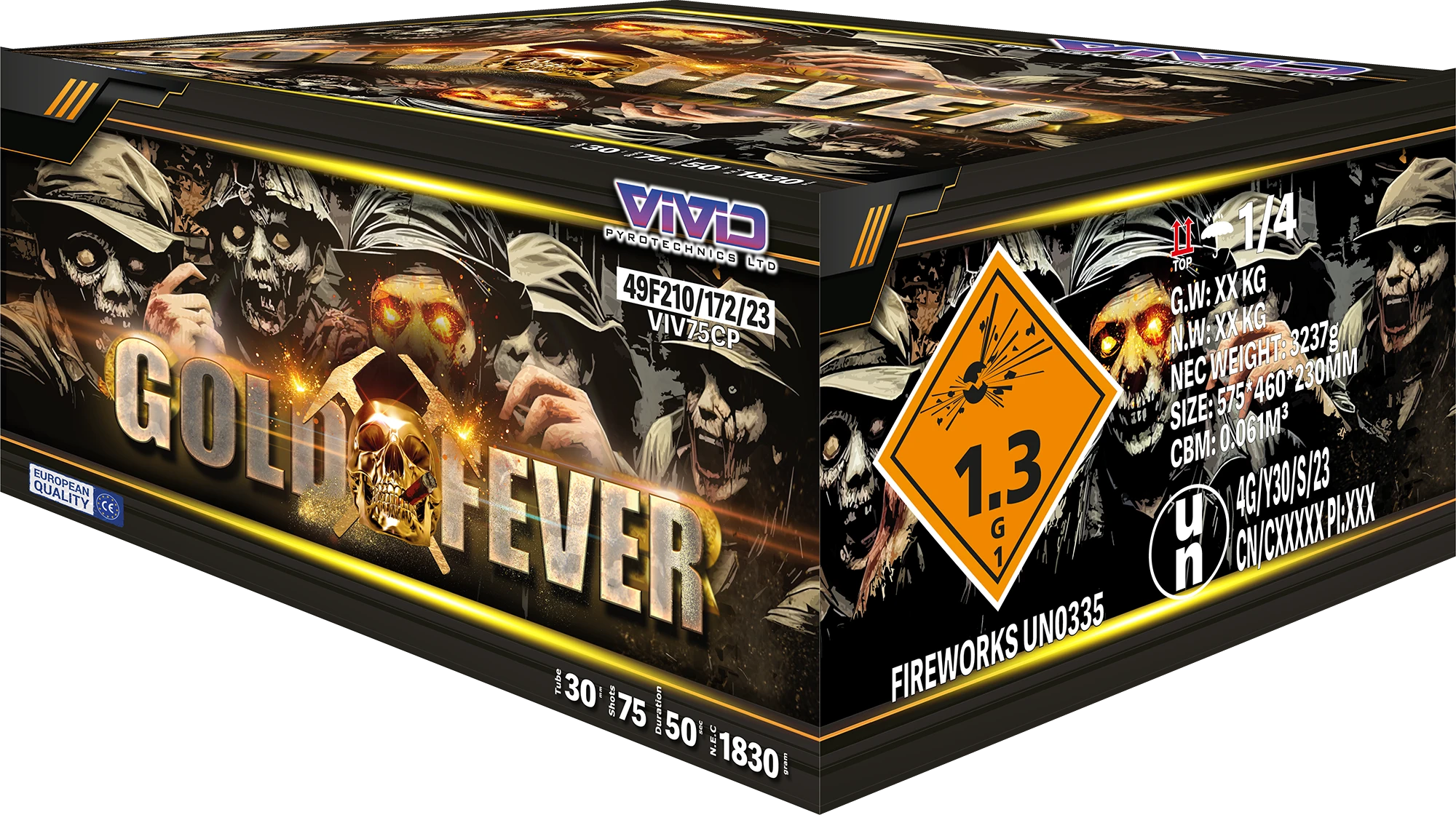 Vivid Pyrotechnics Gold Fever is a sky-filling compound cake that features 75 shots of pure gold from 30mm tubes for a thrilling 50-second display! It consists of a whopping 1,830g of pyro powder and includes a mixture of firing patterns. The finale is the staple, though, a double-fanned finale that fills the sky with a beautiful gold display! The perfect firework for any celebration!